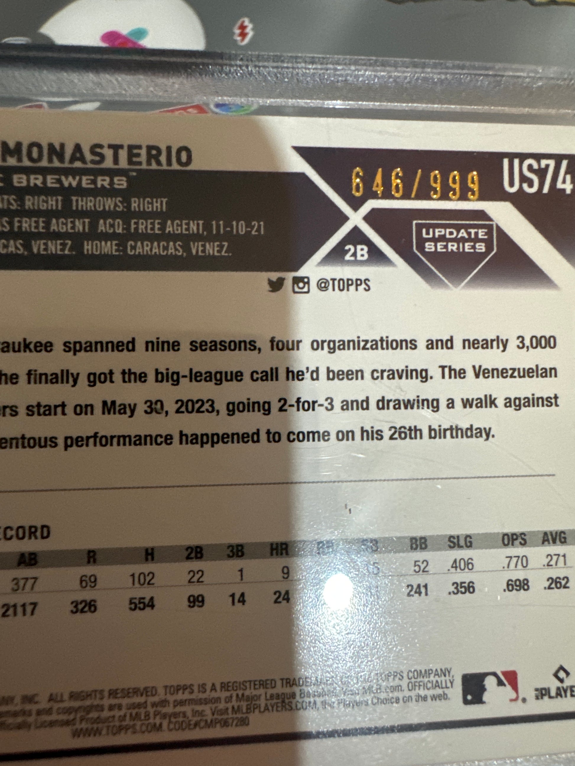 2023 Topps Update series #US574 Andruw Monasterio. Blue foil. Numbered 646/999
